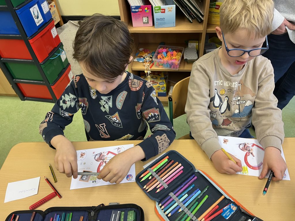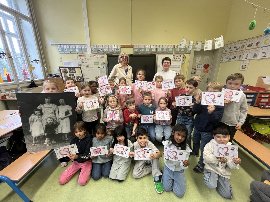 Außerdem hatte Frau Wolters Karten vorbereitet. Darauf konnten die Kinder Wünsche für Josef aufschreiben und Bilder für ihn malen. Sie erzählte vom Leben jüdischer Kinder früher und zeigte unter anderem ein altes Foto einer jüdischen Schulklasse, die auf einem Ausflug waren. Mit auf dem Foto war sogar ein Esel zu sehen. So konnten sich die Kinder ein Bild davon machen, wie die Kinder damals lebten.