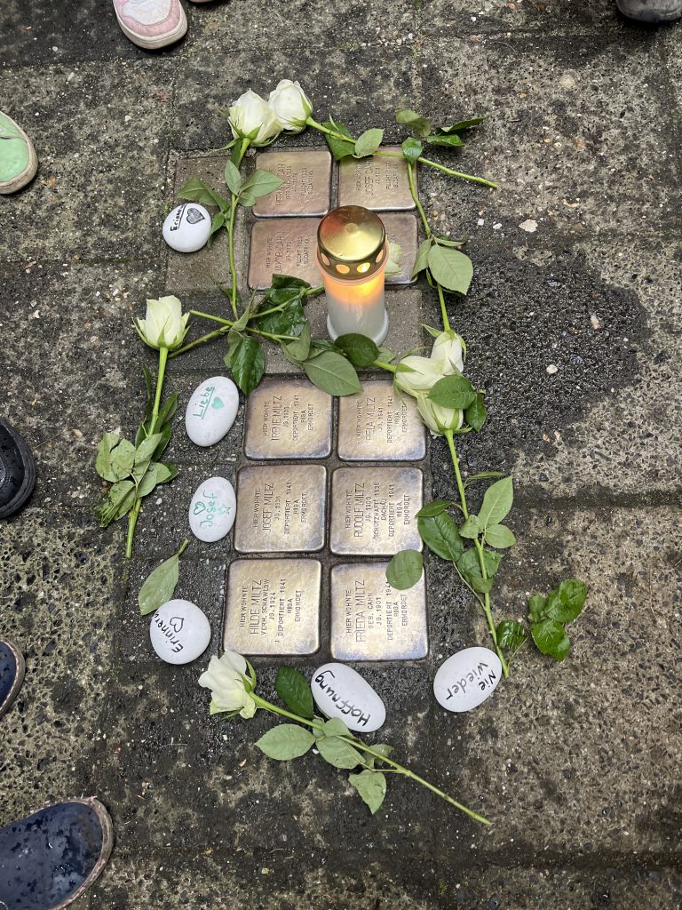 Zum Abschluss des Projekttages besuchte die Klasse den Stolperstein von Josef Miltz und seiner Familie in der Rektoratstraße in Viersen. Die Schule ist seit 2021 Patin dieses Stolpersteins, der Teil des europaweiten Erinnerungsprojekts des Künstlers Gunter Demnig ist.