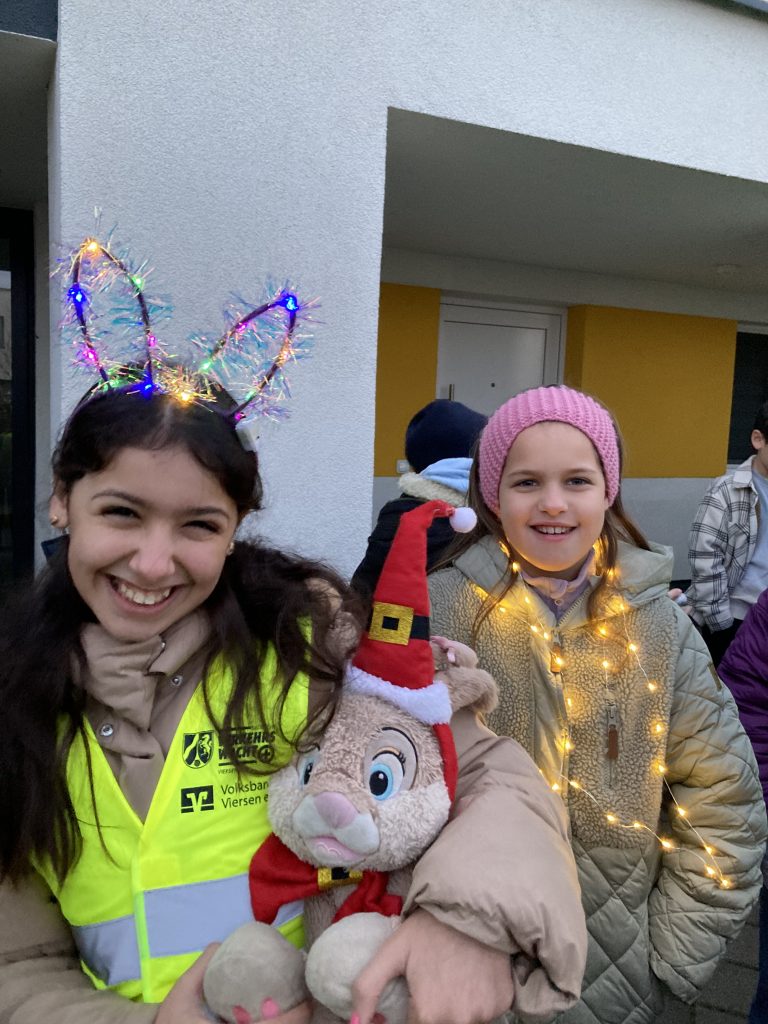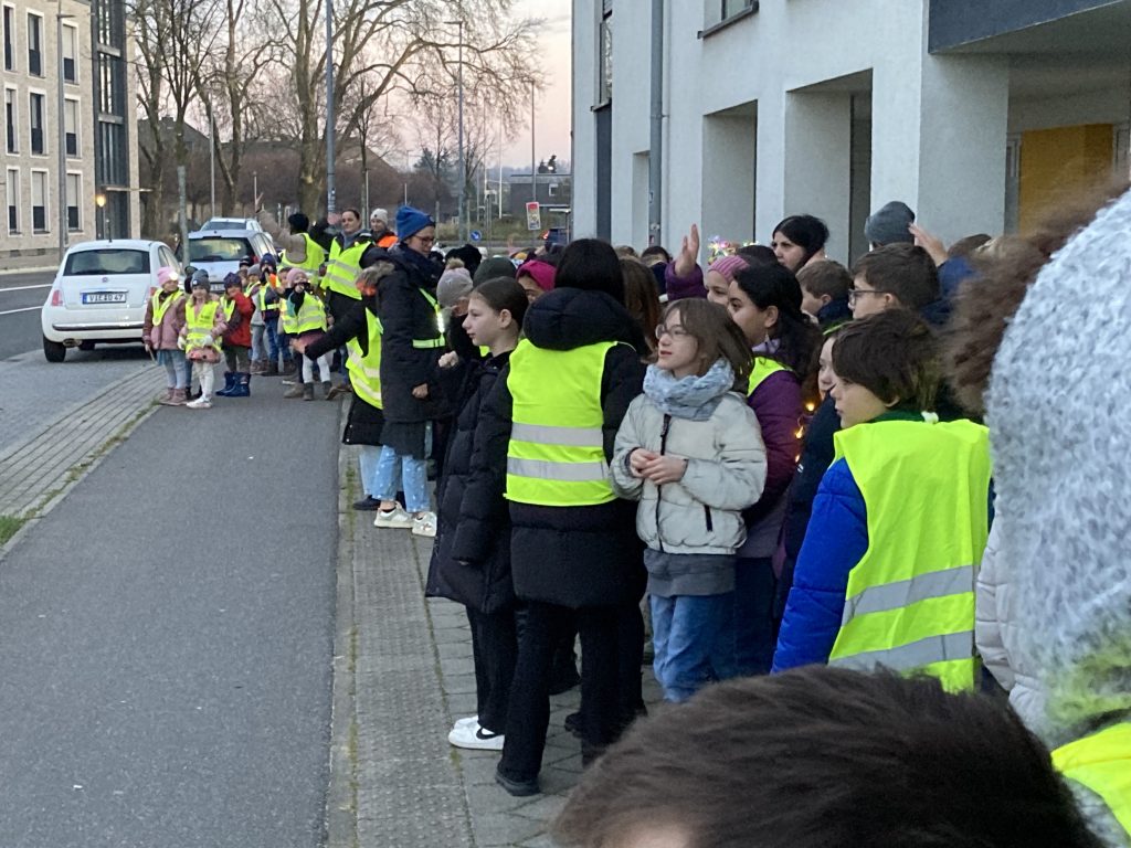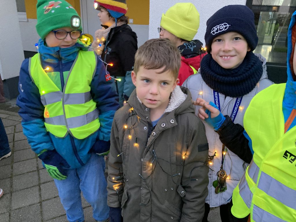 Und dann trafen die Kinder der Kita am Steinkreis auf unsere Schulkinder an der Krefelder Straße und gemeinsam gingen Kita-Kinder und Schulkinder durch die Dunkelheit. Auf dem Schulhof gab es dann die Verabschiedung.