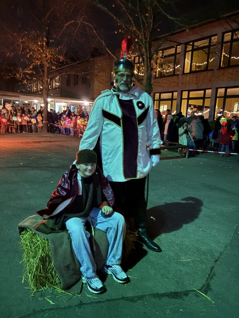 Nach dem Umzug versammelten sich alle auf dem Schulhof, wo die Bettlerszene mit dem Sankt Martin und unserem ältesten Schüler der Schule Ion nachgespielt wurde. Die Stimmung war einfach prächtig. Dank der zahlreichen Essensspenden unserer Eltern gab es ein vielfältiges und köstliches Buffet, das großen Anklang fand – von warmem Punsch bis hin zu selbstgebackenen Leckereien.